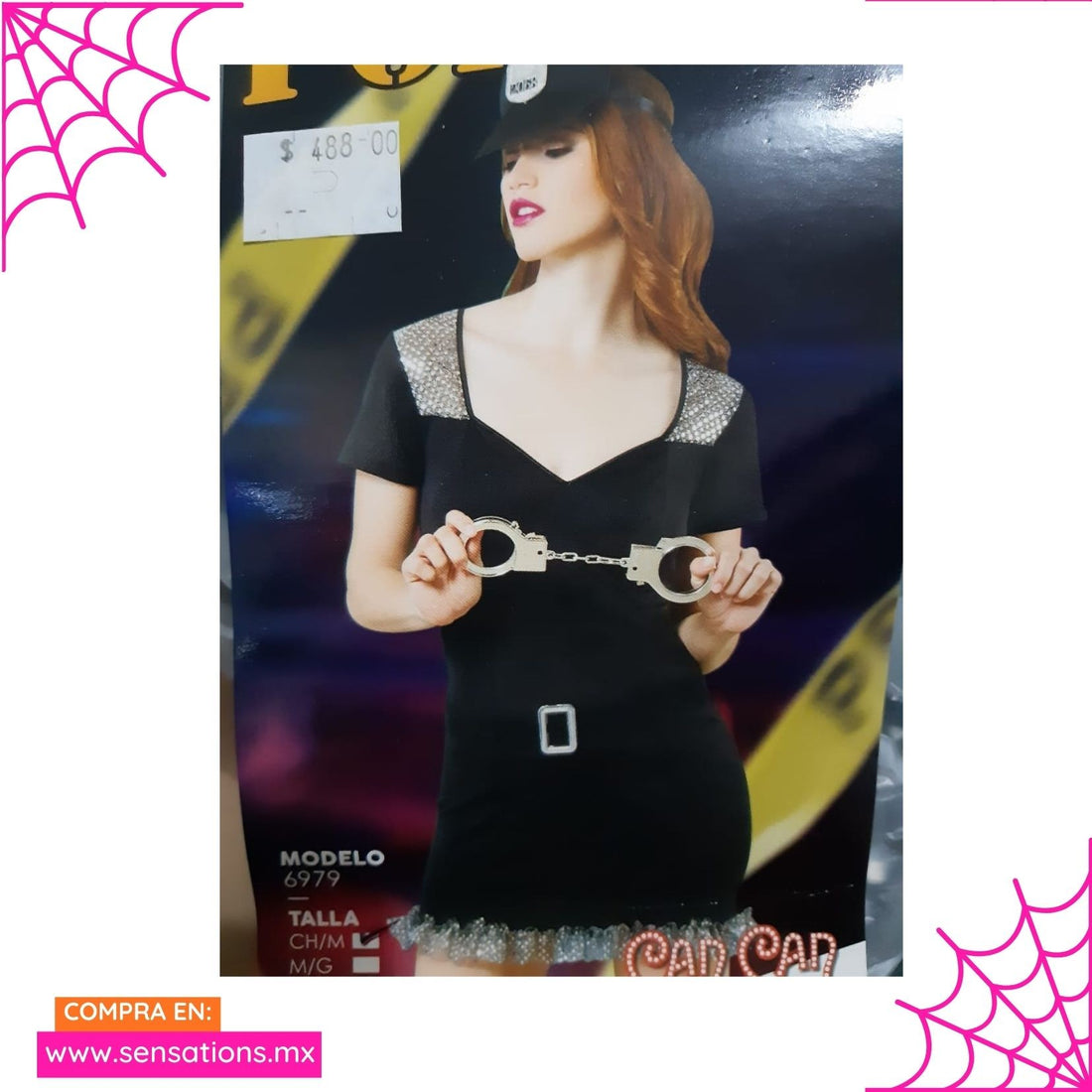 Incorruptible policía. Mini vestido negro con detalles en tela plateada, con cinto ajustable a la...