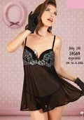 Baby doll en color negro con encaje floral en plata. Incluye tanga a juego. Talla G y EXG