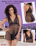 Baby doll para dama en color negro, confeccionado en gasa transparente y encaje, sin varillas en copas sin forro. Incluye tanga a juego. Tallas CH, M, G y EXG