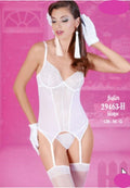 Bustier de encaje y poliamida en color blanco, con tirantes y ligas de elástico. Incluye tanga a juego y medias. Tallas CH, M y