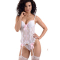 Bustier de encaje para dama, con varillas y copas forradas. Los detalles en satín rosa le dan un toque muy tierno y femenino. Incluye tanga y medias a juego. Tallas CH, M, G y XG