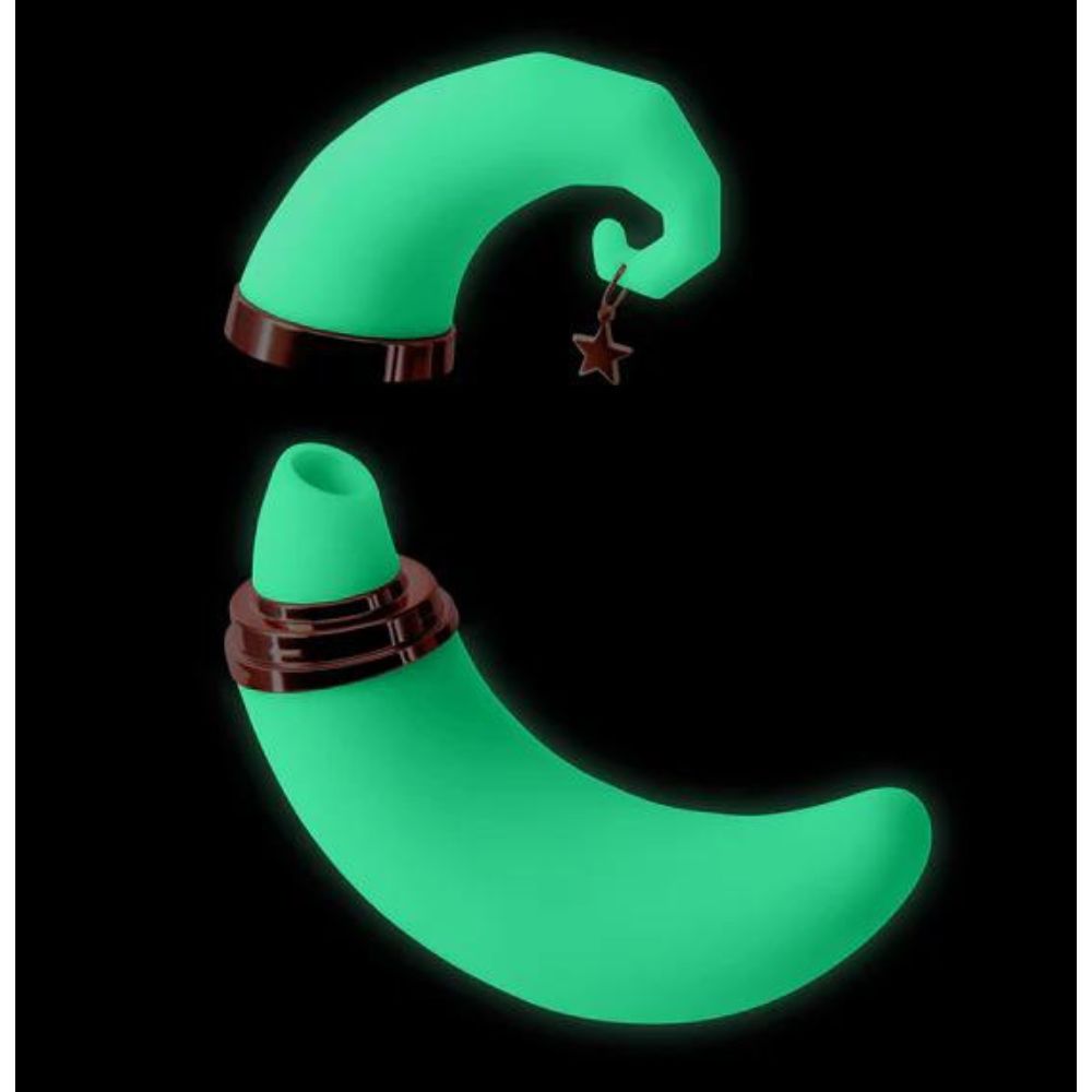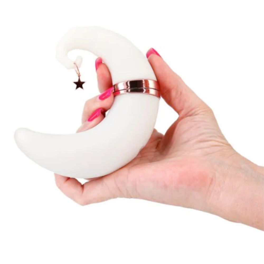 Los dulces sueños están hechos de esto …. Masajeador de pulsos de aire que brilla en la oscuridad en un extremo y un vibrador en el otro, hechos de silicona de primera calidad con un diseño de luna creciente. La tecnología exclusiva proporciona 20 modos de placeres (3 velocidades y 7 funciones en cada extremo). Incluye un soporte de carga con temática de nube. Recargable. Apto con todos los lubricantes.