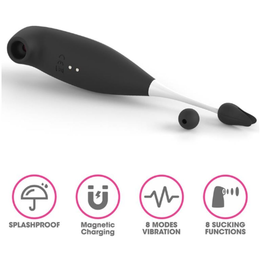 El estimulador Clit Pro es un estimulador dos en uno. En la parte de abajo podrás disfrutar de un succionador, mientras que en el otro extremo una pequeña rosa se moverá con sus 8 funciones de vibración para estimular cualquier parte de tu cuerpo que desees. Ambos extremos son perfectos para la estimulación de los pezones o de la vagina, o ideal para estimular a tu pareja. Disfrutareis de una sensación de cosquilleo increíble.