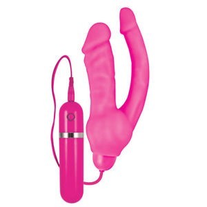 Vibrador de silicona premium. Intensifique su placer con este masajeador personal de doble penetración, sensualmente esculpido, hecho de silicona 100%. La poderosa bala vibradora envía el zumbido a lo largo de las dos barras de placer. Elija entre 10 funciones de vibración estimulante a través del control remoto. La bala vibro es removible para uso separado. Es hipoalergénico, no poroso y libre de ftalatos, impermeable. Medidas: el dildo grueso mide 3.5" de longitud insertable con una circunferencia satisfactoria (1.5" de diámetro). El dildo delgado mide " de largo insertable y circunferencia de 2.25" (0.75" de diámetro). El controlador mide 4.37" por 1" con un cable de 30". Requiere 2 baterías AAA no incluidas"