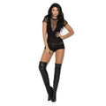 Vuélvete audaz con este mameluco negro opaco que presenta un escote en V profundo con cuello alto de red, mangas cortas de red y espalda completa.