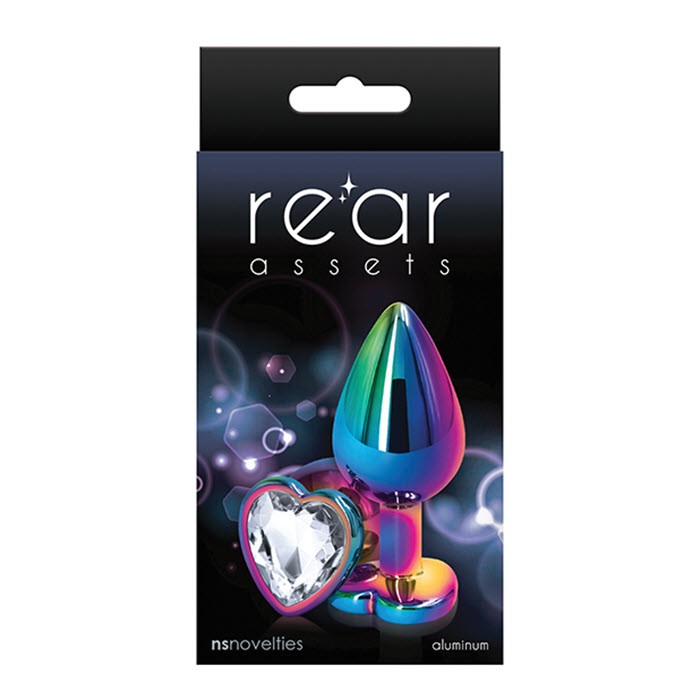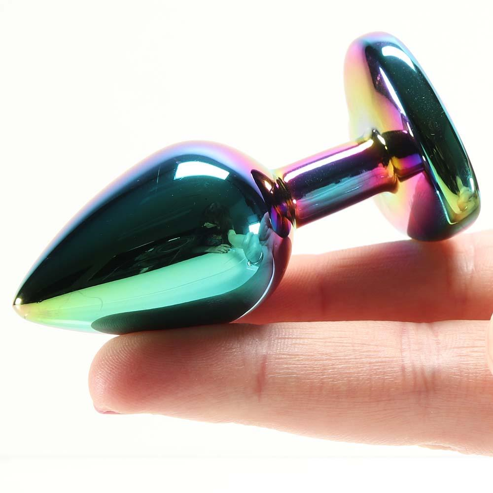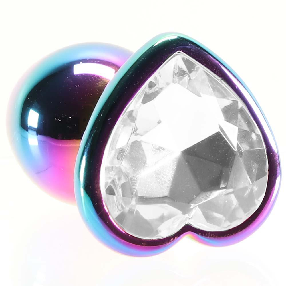 Tapón anal pequeño de aluminio multicolor, con gema de corazón transparente. Es liviano con diseño cromado, ideal para cualquier nivel de experiencia anal y particularmente perfecta para principiantes. Tiene un tamaño agradable y pequeño. Compatible con lubricantes a base de agua y silicona.
