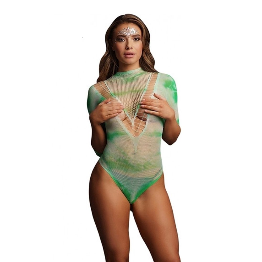 Body Shots Bliss Short Sleeve Verde O/S de rejilla con teñido batik y cuello alto y escote en V de contraste. El body tiene manga corta y la espalda semiabierta. Este body está disponible en tallas de la S a la XL. Si quieres lucir un look de verano atrevido, póntelo por encima de un bikini o combínalo con pezoneras adhesivas y unos pantalones cortos. ¡Para añadirle resplandor ponte el adhesivo facial brillante con forma de corona y brilla como un diamante toda la noche!