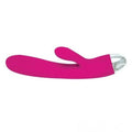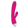 Vibrador de conejo rosa con motores duales para estimular punto G y clítoris. Siete funciones de golpeteo y calentamiento.